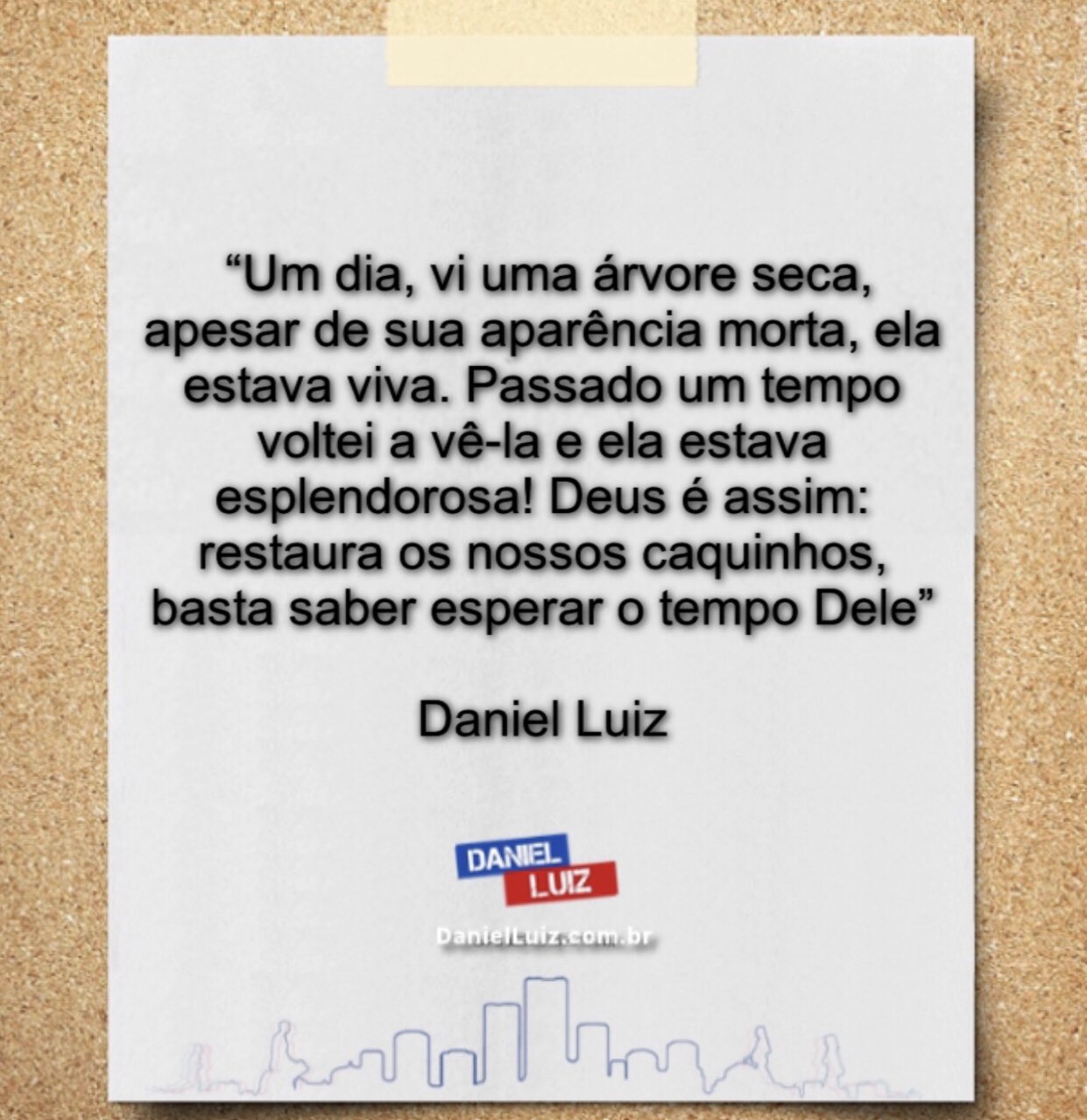 “Um dia, vi uma árvore seca, apesar de sua aparência morta, ela estava viva. Passado um tempo voltei a vê-la e ela estava esplendorosa! Deus é assim: restaura os nossos caquinhos, basta saber esperar o tempo Dele” Daniel Luiz